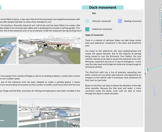 Me, Simon Dore and Michael Evans were given a site in Dingle, Merseyside, to design an urban design masterplan. There were no restrictions on what we could design but we used statistics, knowledge and our own experience of the site to come to an agreement on what we thought should happen at this site. Water is the main concept of the scheme: its uses and how it can link areas together with a sustainable use.